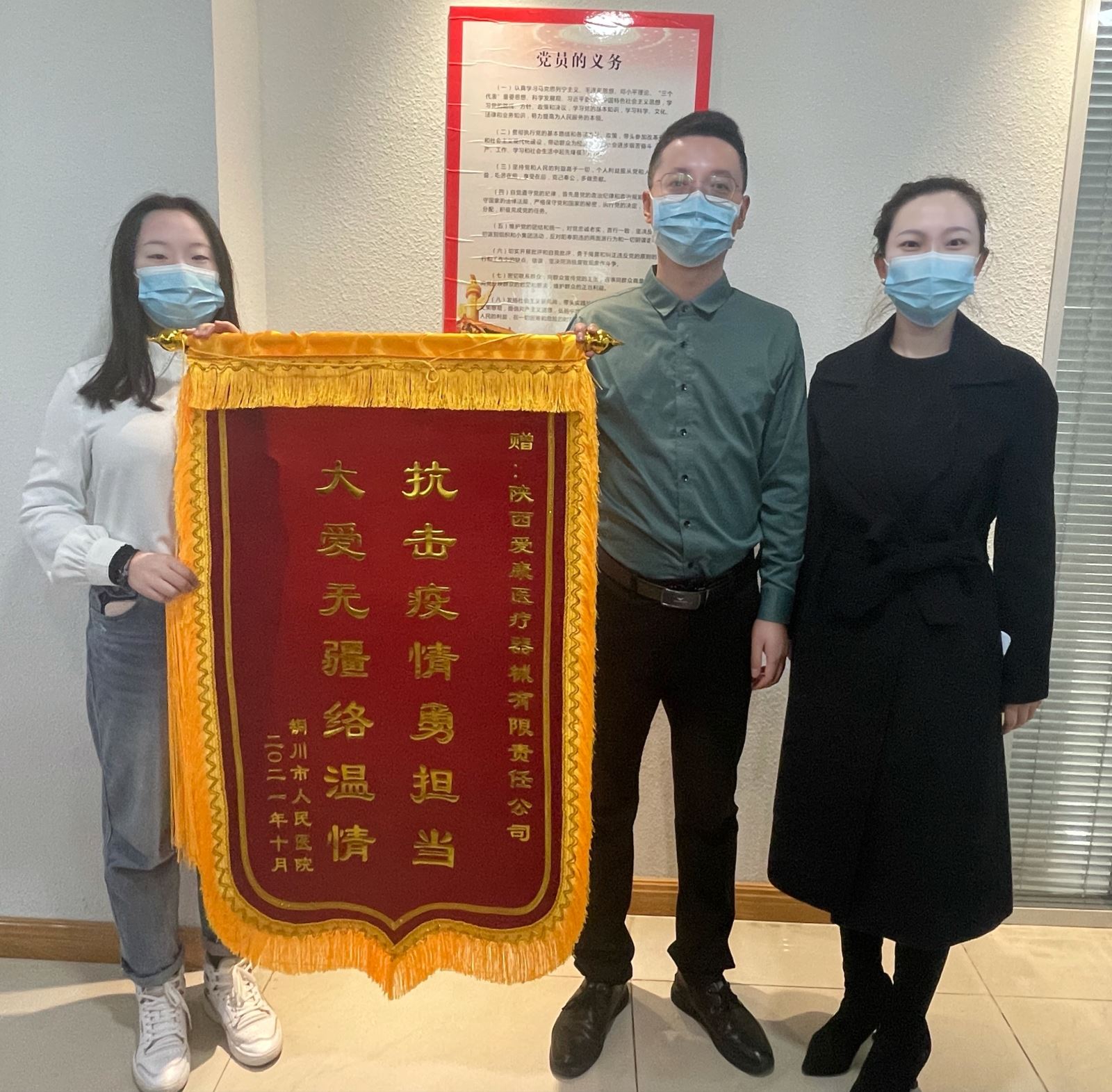 2021年10月,愛康集團銷售副總夏蓓蓓在銅川市人民醫(yī)院進行業(yè)務溝通時,醫(yī)院方將一面寫有“抗擊疫情勇?lián)?,大愛無疆絡溫情”的錦旗送至夏副總的手中,感謝我司在整個抗擊疫情的過程中對醫(yī)院的全力支持。